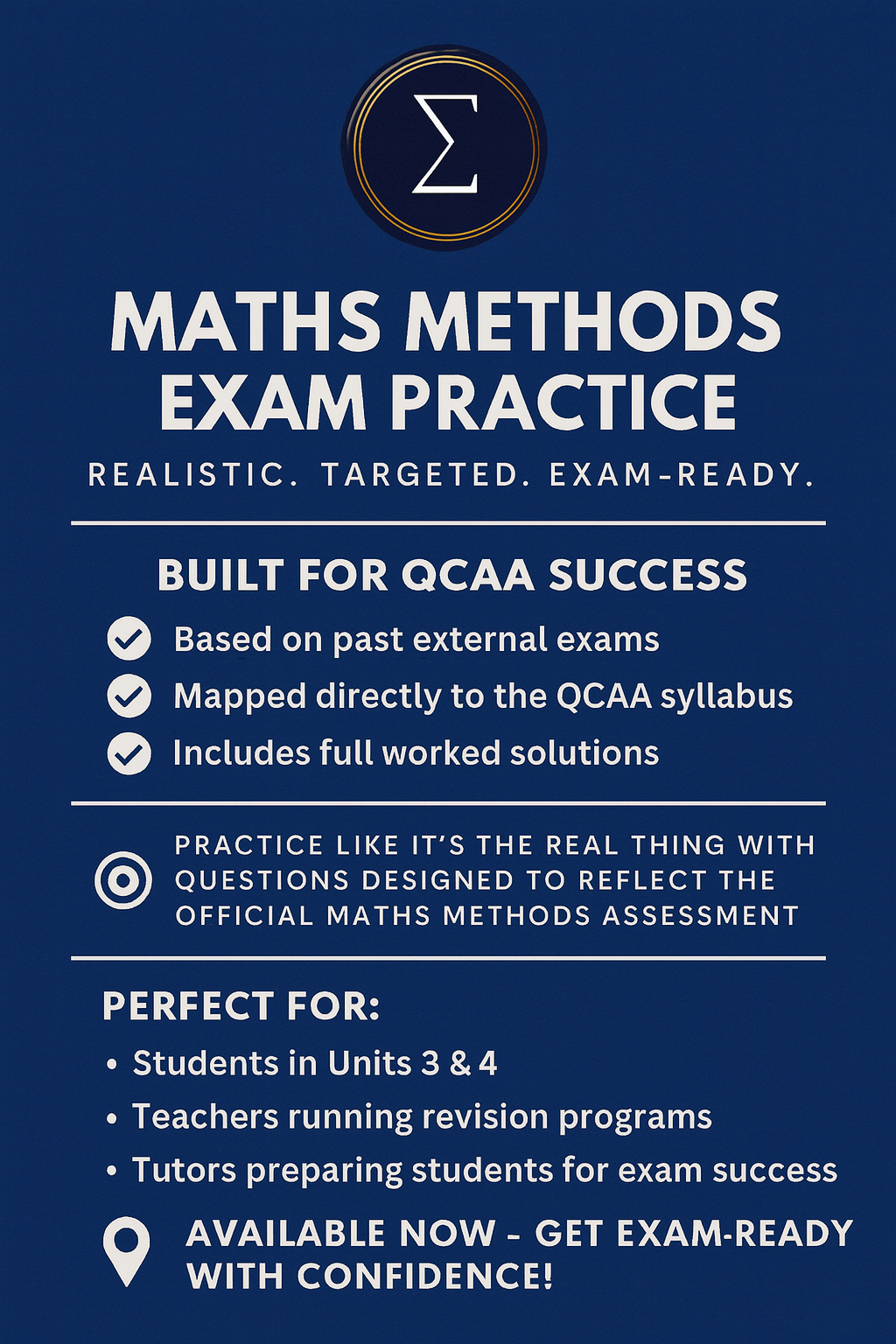 Categories: All Maths Methods Tutoring Index Laws Revision Sheets Tests All | Maths Methods | Tutoring | Index Laws | Revision Sheets | Tests | Maths Methods Practice External Exam 1 Bundle $2.99 Maths Methods Tutoring $75.00 Index Law Test with Video Solutions Sale Price: $9.99 Original Price: $24.99 Sale